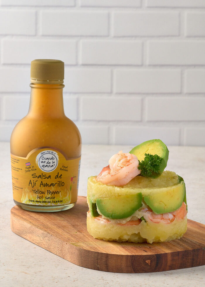 INGREDIENTES 1 kilo de papas amarillas 2 cdas de Salsa de Ají Amarillo 500 gr de camarones limpios media cebolla morada 3 cdas de mayonesa 2 aguacates 1 limón sal y pimient