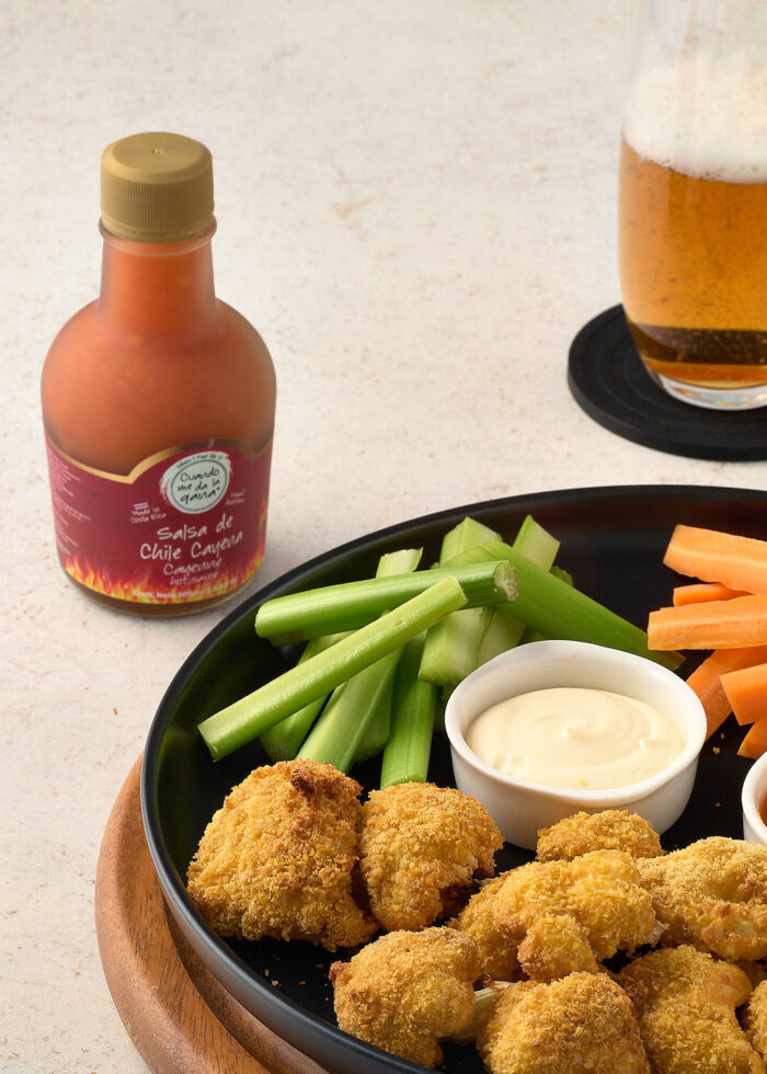 INGREDIENTES 1 taza de harina todo uso 1 taza de agua 1 cucharadita de ajo en polvo 1 cucharadita de sal 1 cabeza de coliflor, cortada en floretes 1/2 taza de Salsa de Chil