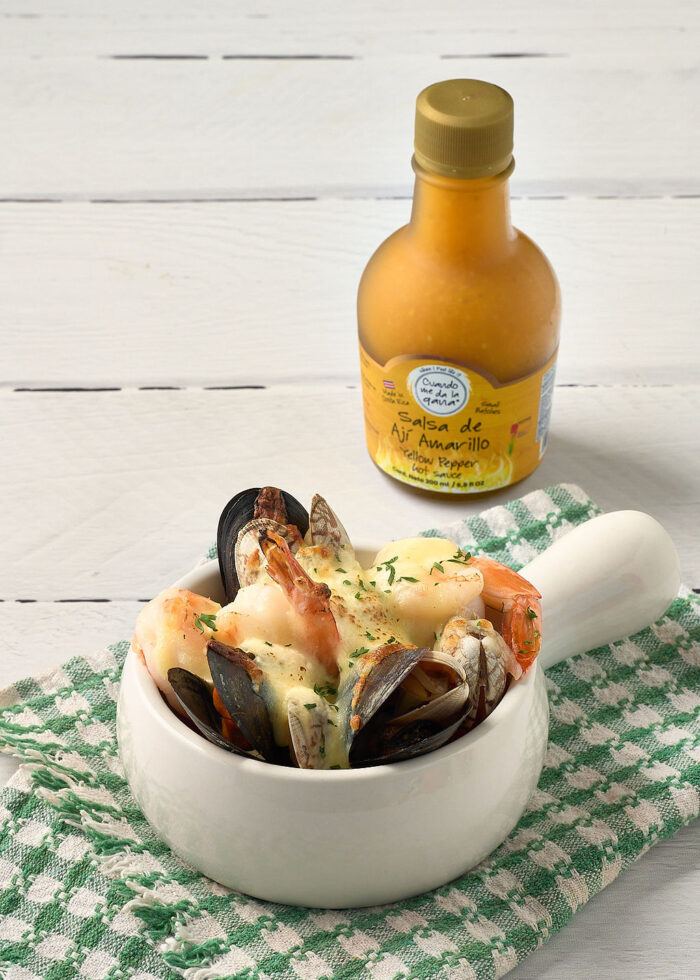 INGREDIENTES 500 g de surtido de Mariscos 100 g de mayonesa 60 g de queso parmesano 1 cebolla mediana picada en julianas ¼ taza de vino blanco 2 cdas de aceite de oliva 2 d